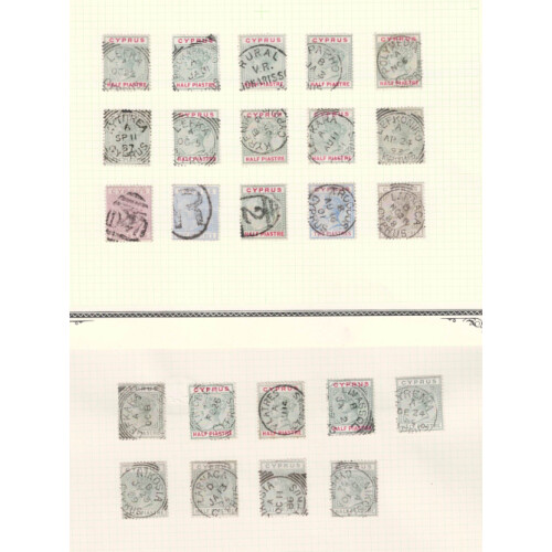 Postmarks: Collection for Cyprus QV-GVI issues neatly arrange and identified on leaves incl duplex numeral 942 (3), 696, 975, 981, 982, 969, D47, QV Larnaca squared circles (20), Famagusta (5), Limassol (5), Nikosia (5), Rizokarpatho, Lefkonia, Lefkoniko, Kithrea, Lefka, then CDS cancels incl Polymedia, Troodos, Kyrenia, Lefkara, more Duplex cancels on 1882-96 (14), EDVII range of cds and squared circles etc. Nice assembly. (Approx. 140).