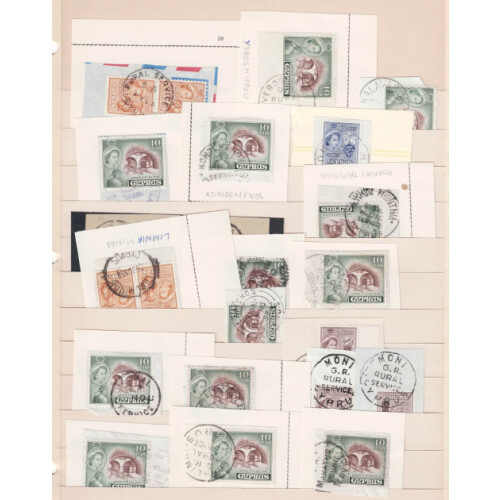 Postmarks: Collection with better range of QV/GV (28) onwards noted 1885 Troodos and 498 duplex cancel tied on paper, Rural service in Yaloossa, Karpesha, Moni, Kato Kopia, Louroudjina, Troulli, 981 duplex on GV, town cancels on GVI on paper (30+), early QEII rural service (25+). Intr lot. Fine.