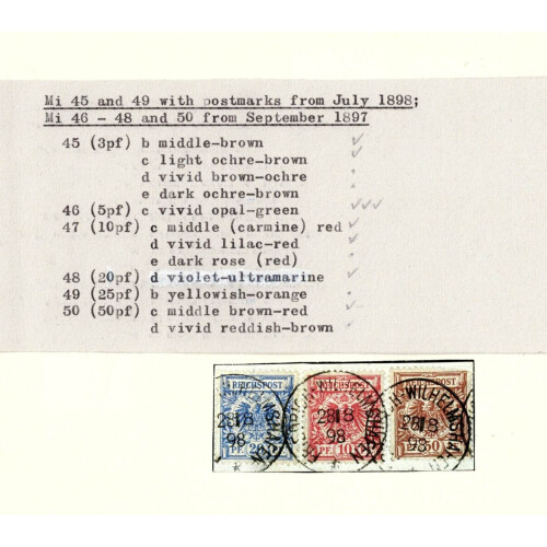 New Guinea: Forerunners; 1890-98 Singles stamps (8) & single stamps on paper (9) with various cancels including FINSCHHAFEN, STEPHANSORT, HERBERTSHOHE, MATUPI, on various values incl 3pf yellow-brown (4), 2m red-carmine, 5pf green, 10pf red (5), 20pf ultramarine (3), 25pf orange and 50pf brown-red (3) huge cat value. (18).