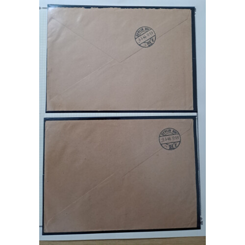 Storkow: 1946 ( 30 Mar) Two registered (philatelic) Covers to same addr in Berlin bearing Stadt Storkow 12 + 38pf miniature sheet tied along with other values by special STORKOW (MARK) cds cancels, 2nd cover with defins surcharged with 7 different values tied similar cds cancels. Creases. Michel Block 1. & 3/8.