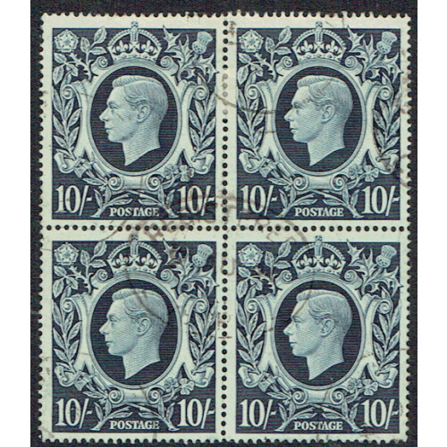 1939 10s dark blue cds used block of four with lower left stamp showing blot on scroll variety, SG 478 ab.