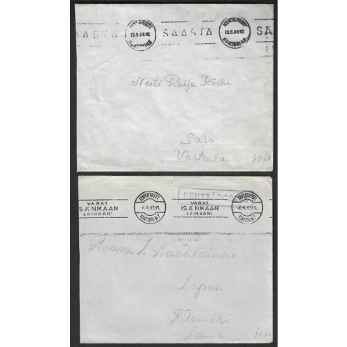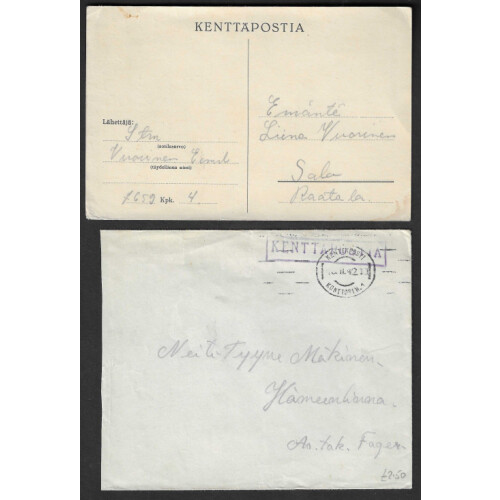 Military Mail : WWII 1941-44 Small group of covers (3) and cards (3) sent by soldiers including two cards showing military caricatures of soldiers; one returning home with a bunch of flowers and the other has two soldiers with their machine guns behind a barricade, one has boxed censor cachet in violet. Fine condition though the covers have been slightly reduced at the right. Unusual group (6)