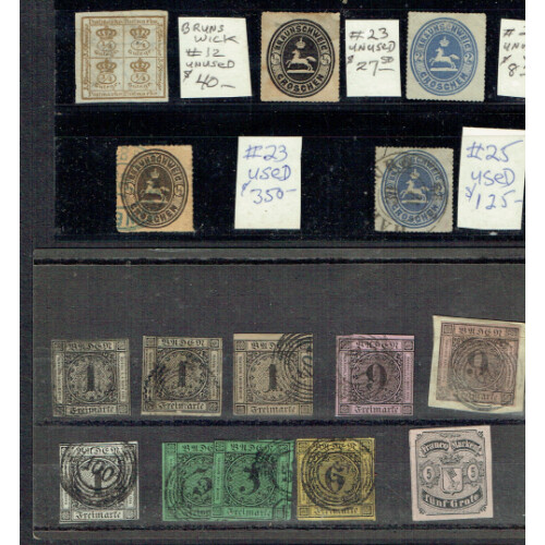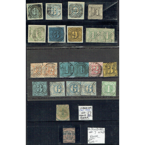 Useful 19th century group stockcards including Thurn & Taxis 1859 to 9k incl 1k green pair, Baden 1851 black impressions to 9k on dull rose or rose used on paper (SG 6 cat £250), 1853 set 3 used, 1862 to 30k orange incl 9k & 30k mint, Wurttemberg 1851 1k 4 margins (SG 1, thin, Cat £170), 3k, 6k & 9k on pale rose on paper (4 margins), Brunswick 1853 1sgr (SG 6 4 margins), 2sgr on blue, 3sgr on pale rose (4 margin Cat £140), 1861 1sgr on yellow (2), 1857 Quarter 4/4 blk of 4 unused, 1865 2gr blue f.u. (SG 32 cat £200), useful little lot, taken as is.