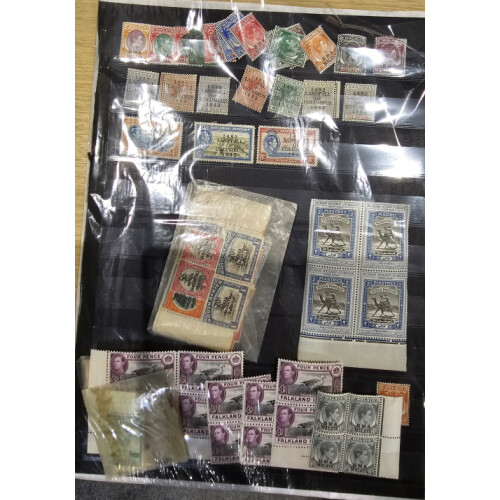 GLORY BOX - Small box with worldwide range on stockcards, in packets stockpages and loose, noted some Br. C/W mint GVI incl Falkland Is. 1938 9d used blk of 9, 4d in U/M pairs and blk of 4, Bahamas 1942 Columbus to 1s mint, K.U.T., GB 1934 Seahorses used two sets, Suez Canal ranges (taken as is), a couple of better EUROPA sets U/M etc. 100s.