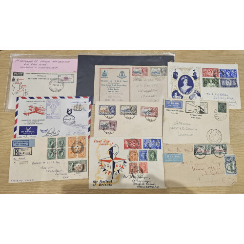 British Colonials: Small group of covers includes 1935 Silver Jubilee Bermuda 2 vals tied IRELAND ISLAND on printed cover and HMS DANAE / BERMUDA / MAY 6th -1935 h/s underneath, 1935 SJ set Barbados, 1939 Centenary long cover folded and toned, GB 1953 Coronation with latin inscription, 1951 Festival ptd FDC plus light colours set in combination, Ceylon QV P/S & PPCs, BMA Malaya GVI commercial mail in combinations, Nyasaland 1933 Air Mail Zomba to Fort Jameson with FIRST NYD AIRMAIL d/r cds (faults) plus various others. (c28).