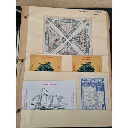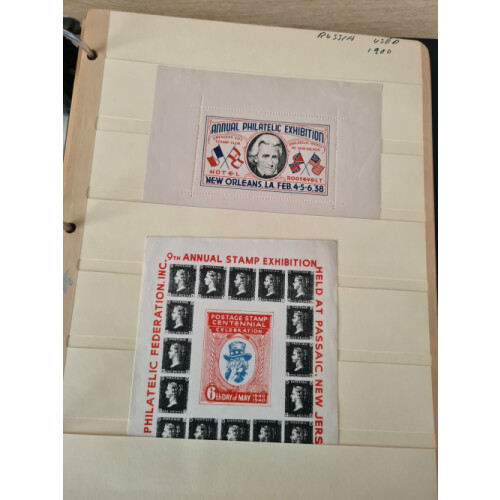 USA: Stamp Exhibitions nice collection 1916-1972 with dozens of labels for each year, souvenir sheets from different states, noted 1938 New Orleans Hotel Roosevelt souvenir sheet, 1940 Phil. Fed 6th May 9th Stamp Exhib. souvenir sheet, 1937 BIPEX Bronx-Inter board Phil. Exhib. Souvenir sheet plus many more. Plus some bank seals. Approx. 210+ items.