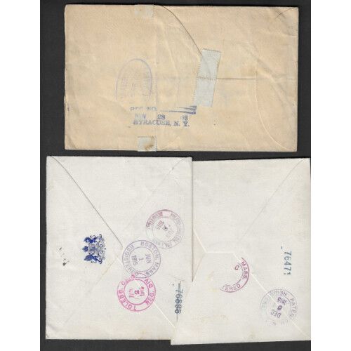 Newfoundland: 1898-1915 Group of three Registered covers with better frankings and combinations noted 1898 15c triple weight to USA 3c orange strip of 5 with SUSPECTED LIABLE TO POSTAGE DUE, 1915 two covers to USA 1897 4c green pair, & 1915 HMS 8c orange Fishing, nice trio. (3).