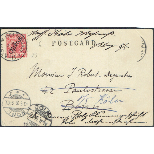 German P.O in Tientsin: 1901 Postcard of a street scene in Tientsin to Germany (redirected) bearing 10pf red with diagonal ovpt tied TIENTSIN a DEUTSCHE POST cds, another stamp appears to have been removed, fine.