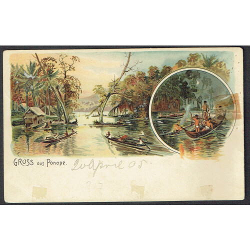 Caroline Islands: 1905 (20 Apr) Gruss Aus Ponape PPC (large side tear with old tap on obverse) to Belgium bearing 10pf Cameroun Yacht bisected vertically and tied full negative strike of PONAPE KAISERUCE postage cancel in black. Used as a provisional after a typhoon destroyed stocks of the 5pf.