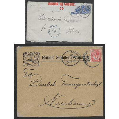 South West Africa: Post independence group of covers 1916-17 Five censored covers to Switzerland or locally addressed. Each bearing Windhoek Post oval cancels with Deutsche removed from the oval cancel tying South Africa GV defins incl nice combinations. Includes one piece.