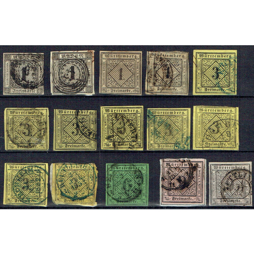 Wurttemberg: 1851-52 Stockcard of 15 examples duplicated mainly used incl 1851 1k black on buff mint large part original gum with expertising mark with 3 margins (Cat £1800), 1k used (3), 3k (8), 6k with 4 margins, & 9k (2 both shades 4 margins), mixed condition but good cat value. (15).