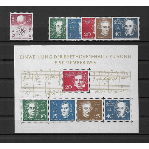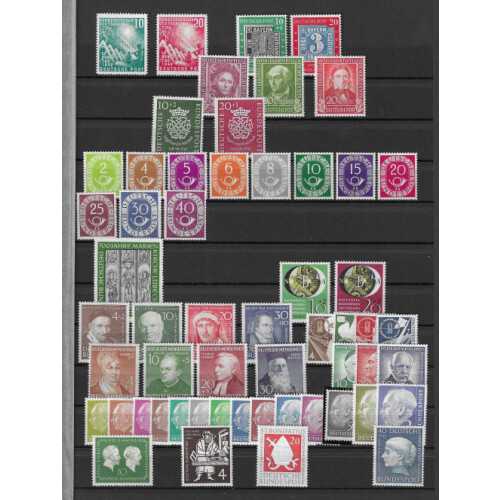 1949-59 Unmounted mint collection of complete sets on double sided stockpage includes 1949 Opening of Parliament, First German Stamps, UPU, Relief Fund set, 1950 Bach, 1951-52 Posthorns (Cat €2200), 1951 Charity, 1951 Phil. Exhib., 1951-2 Relief Fund sets, 1953 Transport, 1954-60 Heuss long set (Cat €300), mainly fresh.