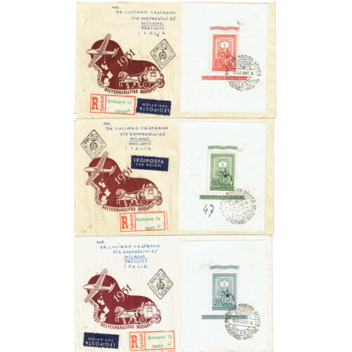 1951 (6 Oct) 80th Anniv. of First Hungarian Postage Stamps set of three miniature sheets used on illus. Exhibition regd covers each with separate M/S tied special cancels, two are FDI addr to Italy. Vertical wrinkles but does not detract, nice set 3, SG MS 1199a.