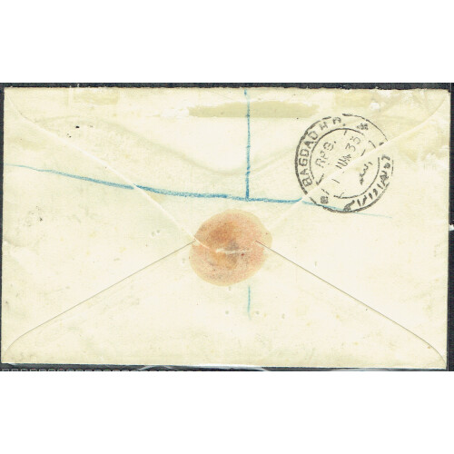 1933 (1 Jun) Registered cover to London bearing 10f yellow (3), 20f orange tied BAGHDAD cds, sent airmail with No.210 regd etiquette. Nice combn.