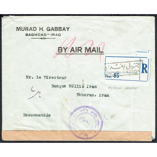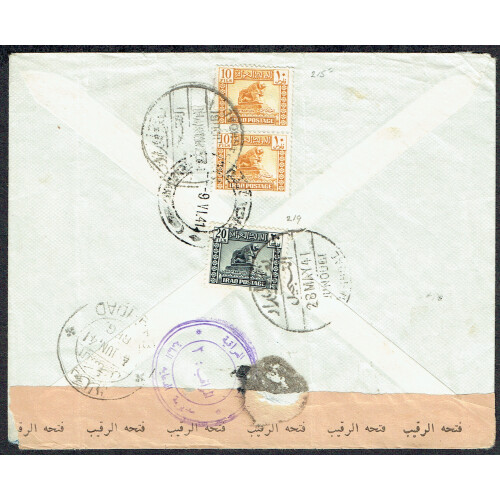 WWII 1944 Censored regd cover Junoubi to Tehran bearing 10f pair, 20f black, tied bilingual cds, with Arabic censor label and two violet sealing cachets.