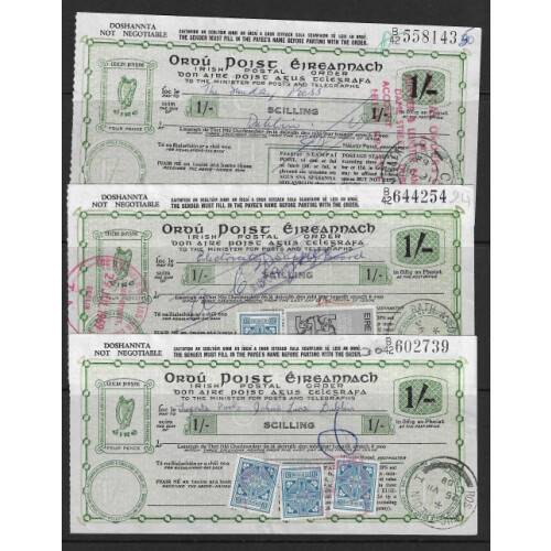Postal Orders: 1969 1 Schilling green and black, three different cashed orders, two with additional stamps from three different areas incl CORA CHAITLIA, RATH MAONAIS 1ROS MHIC TREOIN I, couple of small wrinkles otherwise sound, nice trio.