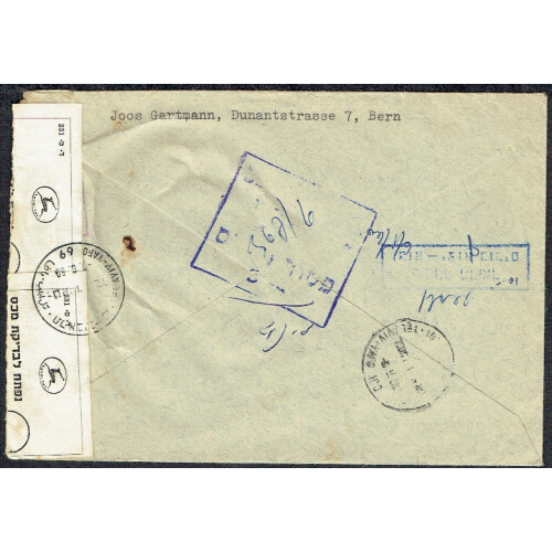 1960 Israeli Censored Airmail cover Switzerland (Bern) to Tel Avivi, Israel tied 155c combination with Bern special cancels, and two Israeli black on white 231 Antelope censor tape sealing the envelope tied with bi lingual TEL AVIV YAFO cds cancels, and two further violet boxed censor h/s on reverse, few tones and some wrinkles.