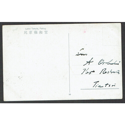 Post Offices in China: 1921 PPC Lama Temple Peking sent to Tientsin bearing 2 CENTS Pechino surcharge on 5c green tied part PECHINO CINA cds cancel, fine.