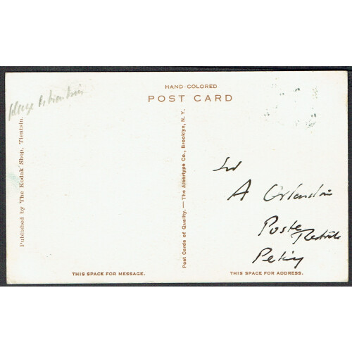 Post Offices in China: 1921 PPC Lotus Hill Forest Peitaiho sent to Peking bearing 2 CENTS Tientsin surcharge on 5c green tied part TIENTSIN CINA cds cancel, fine.