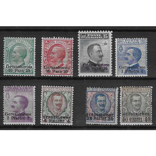 Post Offices in the Turkish Empire: Jerusalem; 1909 Complete set of eight mounted mint, with usual gum tropicalisation, all fine frontal appearance, key 20pi on 5l is centred NW, 40pi on 10l has pulled perf, huge catalogue value set, SG 125/132.