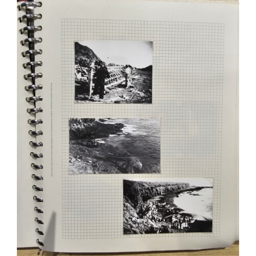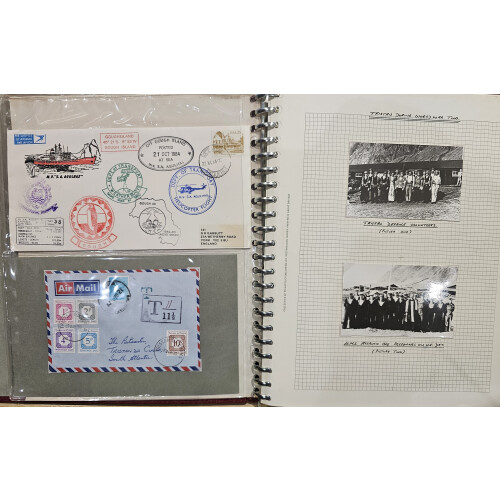 Collection of photographs, covers and cards in a binder with a group of sepia real photos showing Tristan During WWII incl HMS Atlantic Navy personnel with the Chaplain, Defence Volunteers, Reverend with Island Church, on watch from the Radio Office, The Island School plus others, then range of special cacheted covers including from the Resettlement 1963 to 1980s FDCs, incoming P. Due cover from 1980, some better airletters etc, fascinating lot.