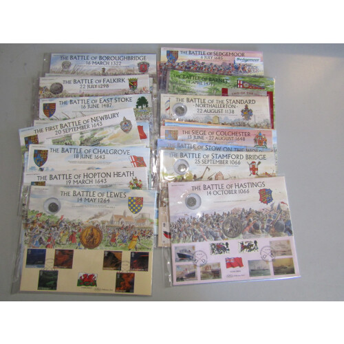 2004-2009 Heritage of Britain large covers (62) each detailing a Battle in the UK from AD991 to 1745. Each bearing GB sets of stamps tied special Anniversary Cancels, many are signed (51) by current Lord Lieutenant or Vice / Deputy Lieutenant Figures for related area of the country from each battle, a few with replica coins in plastic case in the cover, profusely illustrated and full details of each battle on reverse. Huge original cost from Benham. (62 covers, current retail £820++).