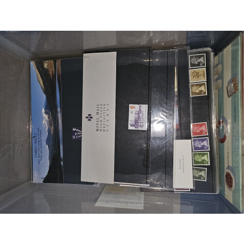 Presentation Packs, large group of 1970s to 2001 in plastic crate, includes some better values to £3, many sets, some regionals and swap out defins, good face value.