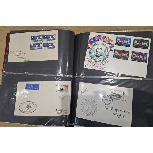 1963-1984 First Day Covers collection in a well filled cover album, many official covers with complete sets, noted 1984 Insects set to £4 on three covers, 1983 Anniversary to £2 on three covers, 1981 Fish (2) one with Fox Bay Cancel, 1976-77 Elephant Island multi signed cover (3), 1966 Churchill, 1968 Hovercraft cacheted cover with 1960 Birds 1s, 1964 HMS Protector etc (c110).