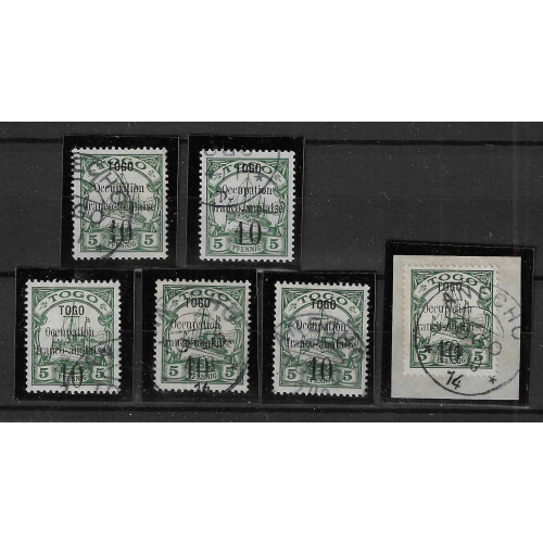 Togo: 1914 Anglo-French Occup. 10c on 5pf green (Type I) group of six fine used examples one on on paper tied with ANECHO CDS's in blue-black, fine appearance, SG 2.