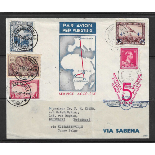 1936-38 Three Belgian Congo illustrated flight covers incl 1936 Brussels to Stanleyville then Elisabethville, 1938 Two covers with different combinations from Brussels to Leopoldville and return flight to Brussels, various cachets and arrival, departure backstamps. Attractive. (3).