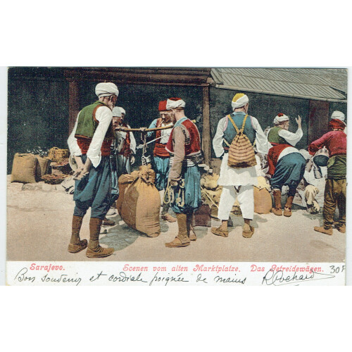 1907 KUK MILIT POST (Aug) Picture postcard of Sarajevo scene from market place, bearing 10k red adhs tied K u K MILIT. POST SARAJEVO cds addr to France, sent from the Hotel Europe. Fine.