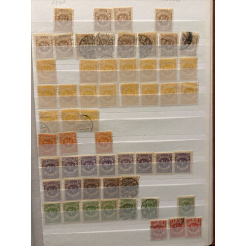 1923 Klaipeda issued under Lithuanian Occupation: Collection of duplicated values mint and used on stockcards and in stockbook with a wide variety of surcharges on unissued official stamps of Lithuania, used cds cancels make up the value with most around $5-$15 range for each stamp (100+ used). Intr lot.