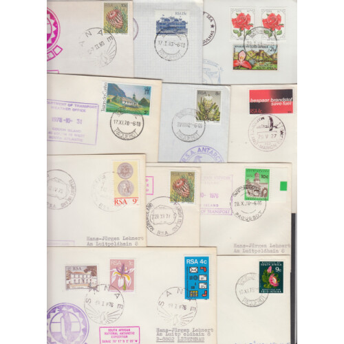 1980's Twenty-one government covers posted off shore in various world locations. Includes 1982 posted at sea from the MV SA Agulhas at Gough Island, 1980 South African National Antarctic Expedition, 1978 Department of Weather Office South Atlantic and 1983 Emergency Causality Evacuation from Marion Island. Very interesting collection.