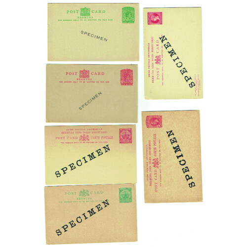 SPECIMEN Overprints on four Queen Victoria and five GV postal stationery cards and registered envelopes, three GVI cards & regd env. Includes QV 1d red reply paid card printed Specimen diagonally on both parts (2), 1d red card, QV Registered 2d grey small size P/S env. (2), Dry Dock Shipyard ½d green & 1d red cards, George V ½d green and 1d red (2) single cards, 2d blue registered envelopes with SPECIMEN diagonally on obverse (2), GVI ½d green, 1d red single cards & 3d blue regd env. Nice group of items.
