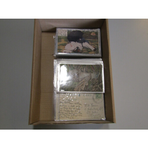 Skeleton Postmarks: A large collection of EDVII-GV Postcards used from many different towns and villages with large skeleton postmarks a huge array incl Conway, Connaghs Quay, Colvelly SO, Hythe, Adderbury, Aberdare, Alford, Andover incoming from Palma, Apsley End, Bargoed Cardiff, Baranrd Castle, Benrhydding, Billingshurst, Bramley, Brynmawr, Buxton, Catford, Groeslon, Grasmere, Grange over Sands, Fowey, Folkingham, Fence Burnley, Rye, St Neots, Sandwich, Uckfield, Wilmslow, Loftus, Market Weighton, plus many more. Mostly fine in sleeves. (Approx 100).