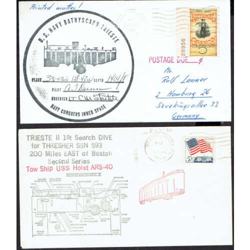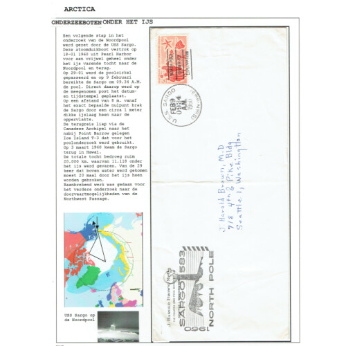 Submarines Under the Ice - Collection of of 8 covers written up in Dutch on pages includes 1960 USSS Sargo North Pole Under Ice Exploration cancel, 1944 US Submarine Atule, 1944 US Sub. Boarfish No.327, 1945 USS Carp built by Electric Boat, 1944 USS Baya launches Electric Boat co., 1960 First Submerged Northwest Passage, 1959 USS Skate (8).