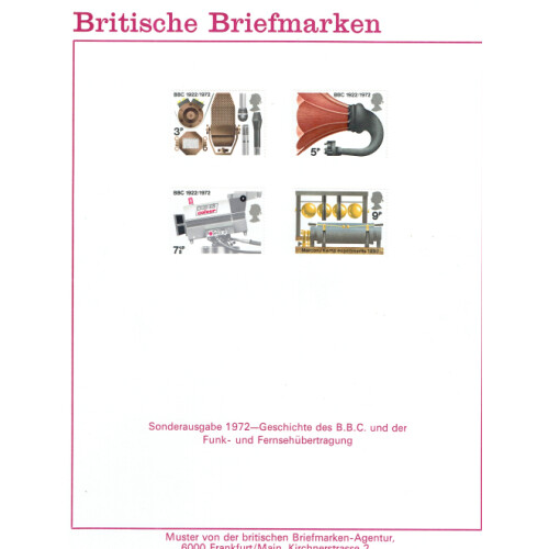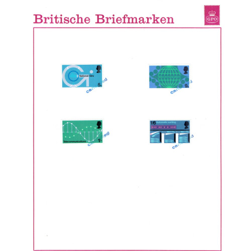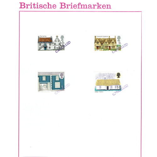 1969-70 GPO Official; A4 size sheets bearing sets of stamps for 1969 Technology, 1969 Xmas & 1970 Cottages mounted on display sheets for publicity overseas printed in German, Britische Briefmarken GPO, each tied by CANCELLED h/s in blue or violet, plus 1972 Churches set uncancelled on publicity sheet, very scarce, rarely offered. (4)