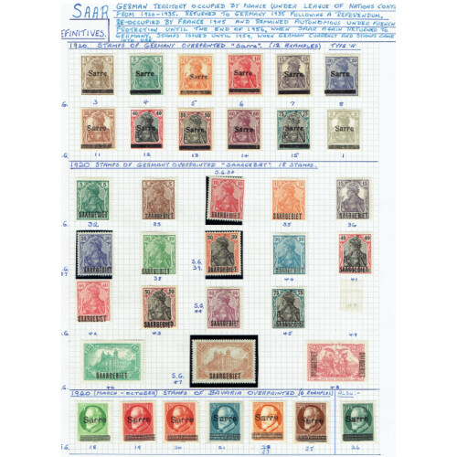 Collection of mainly mint (some used) on leaves with good representation incl 1920 Overprints on Germany, 1921 Miner to 5f mint, 1928 Air set 2 m, 1922 to 3f used, 1922 set to 5f mint (Cat £110), 1926 Views to 5f used, 1934 Plebiscite airs set 4 mint, 1948 air 200f mint, 1952 to 500f mint, 1950 Kolping mint, 1951 Relief Fund set m (Cat £87), 1954 Stamp Day on special card, 1949 Horse Day mint (Cat £46), 1953 Stamp Day on special postcard, 1957 Heuse both sets mint. Useful collection.