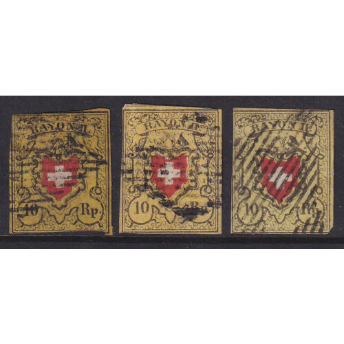 1850 Central cross without black frame; 10r red, black and yellow, 3 shades including yellow, orange-yellow and brownish yellow sound used with 2-3 margins and some faults, thins etc, used with diamond grilled cancels, taken 'as is', SG 10/12, Cat £7095.