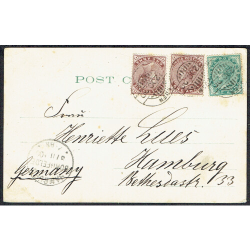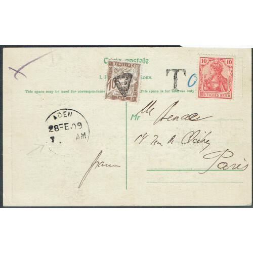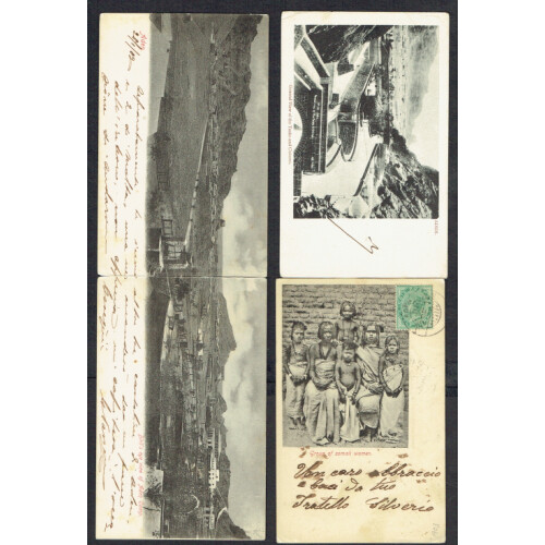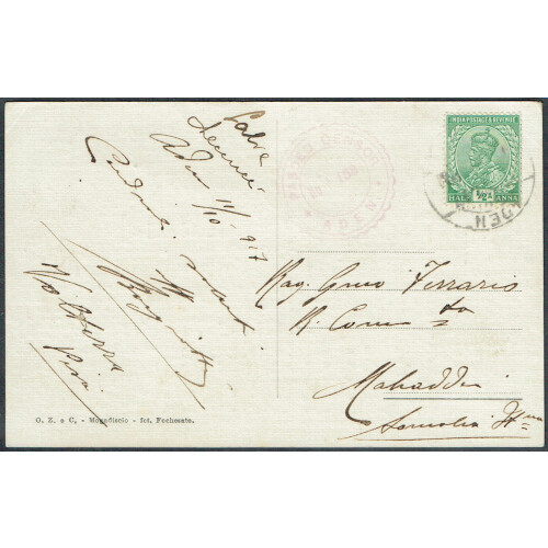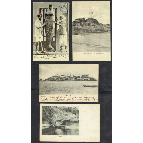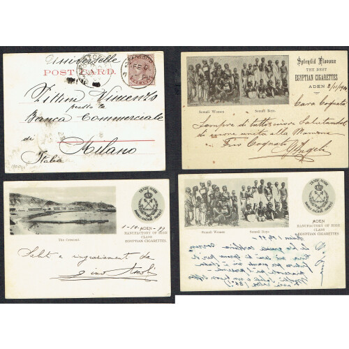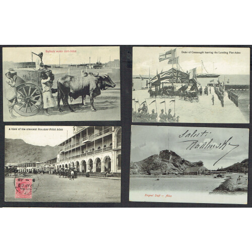 1908-1910 Collection of 18 picture postcards to Italy each bearing 1a red EDVII adhs tied ADEN cds cancels, some nice views of Aden Camp coloured, English Church, Steamer Point, Emperor of Abyssinia, Regimental Barracks, Singnal Staff, Main Street, Duke of Connaught leaving the landing pier, Lahei, The Sultan's Palaces, Bullock Water cart. Intr lot, mainly fine. (18).