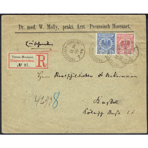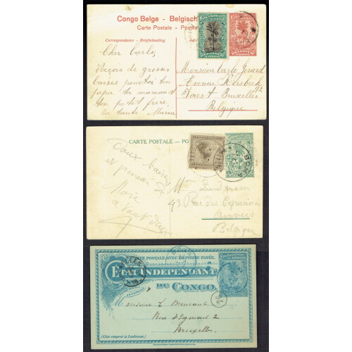 Group of covers including 1896 15c blue P/S Reply card used to Brussels with reply side unused and attached, early used postcard of Ponthierville 10c P/S card uprated to Brussels, 1930 45c P/S postcard of Artillery forces uprated to Anvers, 1948 combn cvr to Switzerland with 8 defins tied KOLWEZI cds's. Nice group (4).