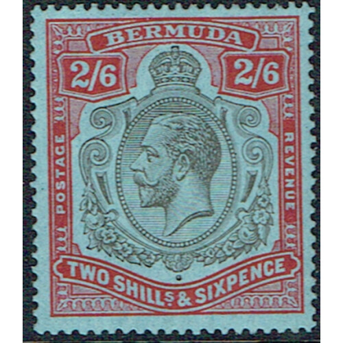 1927 2/6 black and carmine on pale blue hinged mint showing nick in top right scroll variety, fine. SG 89c.