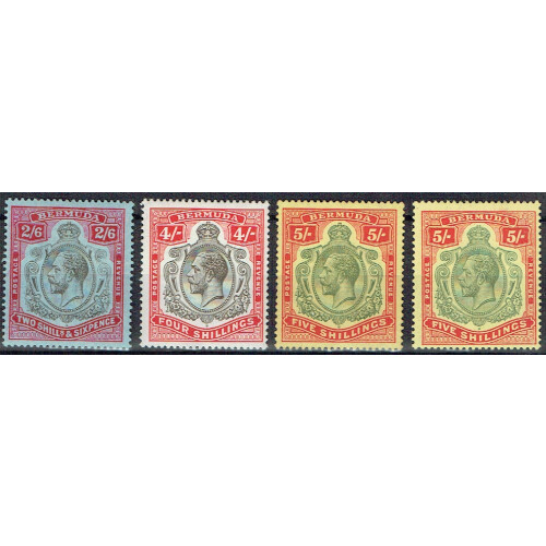 1918-22 Keyplates mint assembly incl 2s (toned gum) with broken left scroll variety (SG 51b be, cat £275), 2/6 black and red on blue, 4s black and carmine, 5s deep and carmine-red on yellow, 5s deep green and deep red on yellow. (5).