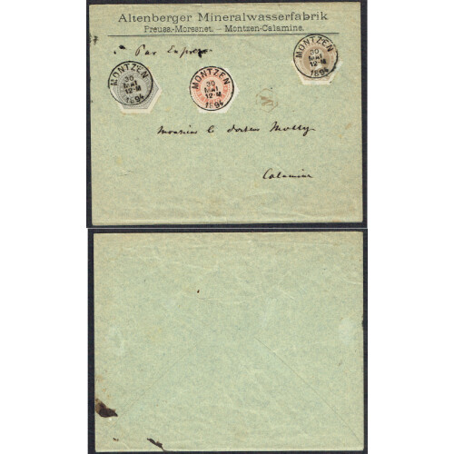 Moresnet: 1894 Telegraphs for postage sent on printed Mineralwasserfabrik Preuss Moresnet bearing 1879 Telegraph stamp 50c drab, 5c grey & 5c brown-orange each tied MONTZEN 30 May 1894 cds cancels. Sent Par Express sent to Calamine. Some creasing / faults. Impressive cover. Hiscocks H1, H8/9.
