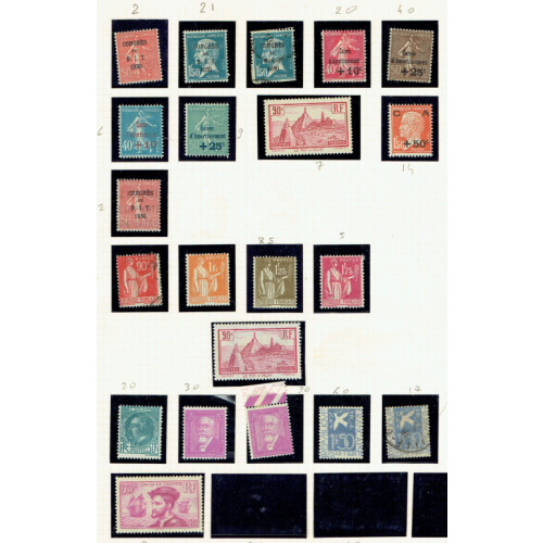 Mixed collection of earlier on leaves includes 1900-06 Olivier & Merson 50c mint (Cat £130), 5fr mint (poor gum, cat £120), 2f used (2, cat £110 each), 1914 Red X mint, 1922 War Orphans Fund to 25c on 1f + 1f m & u, 1927 1f + 25c f.u. (Cat £60), precancels from 1920-1922 (high cat value), etc, good cat values, approx 130.