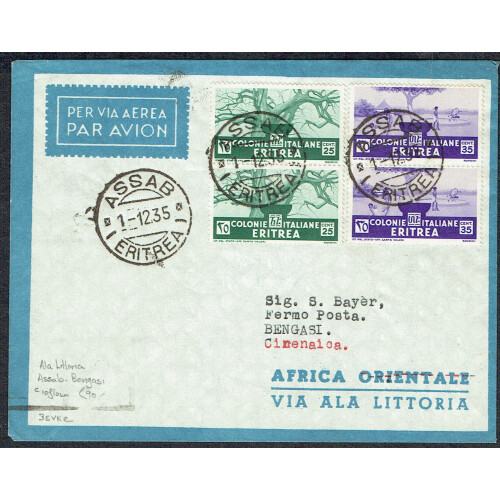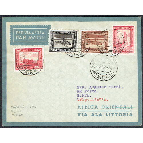 Somalia: 1935 (22 Dec) Ala Littoria printed airmail envelope Magodisco to Sirte Tripolitania with colony adhs 5c, 10c, 20c & 75c tied MOGADISCO / CONCENTR. MILIT. Typed addr, only 10 covers flown, very fine. Type 35 WGB.