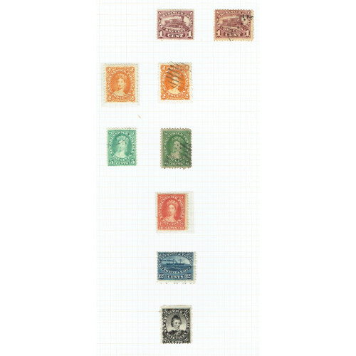 1859-1896 Useful used assembly noted 1859 Chalon Heads to 6d (SG 9-13 Cat £395), 1862 1d (SG 15), 1863 (SG 18-19), 1863-5 1d to 6d (SG 20-25 Cat £247), 1869 Postage Ovpts to 1s for diff printings (Cat £1190), 1874 1d (SG 65 cat £130), 1870-73 Postage vertical ovpts, 1874 5s rose (3 shades 1875-6 1d both shades (SG 76/7 Cat £205), 1876 1d (SG 81 Cat £130), 1877 surcharges, POSTAGE with dot on 6d violet, 1877 ½ HALF surchs mint (3), 1880 set 6 used, 1891 2½d on 4d brown mint, 1895 ½d on 6d violet 5 types mint, etc, comprehensive lot. (77).