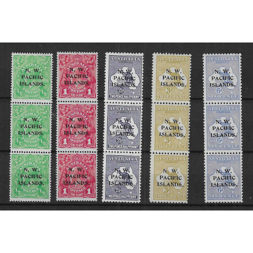1915-16 Vertical strips of three fine mint for ½d green, 1d red, 2½d indigo, 3d yellow-olive, 6d ultramarine each showing the three different overprint settings A, B, C, fine. (5 strips).