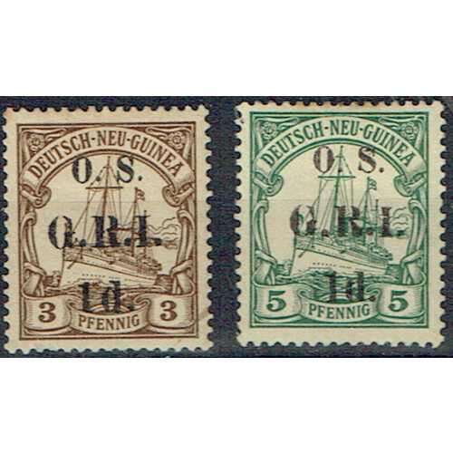 Australian Occupation: Officials 1915 German New Guinea OS surcharge 1d on 3pf, 1d on 5pf green hinged mint, minor marks, SG O1/2. Cat £135.