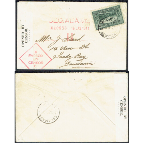 1941 Censored cover to Tasmania bearing New Guinea 5d Goldfields tied BULOLO cds cancel with OPENED BY CENSOR label affixed and tied 6 PASSED / BY / CENSOR / 6 in red on obverse and GEO ADAMS 11 dated arrival h/s alongside, SALAMAUA transit cds on reverse. Small faults.